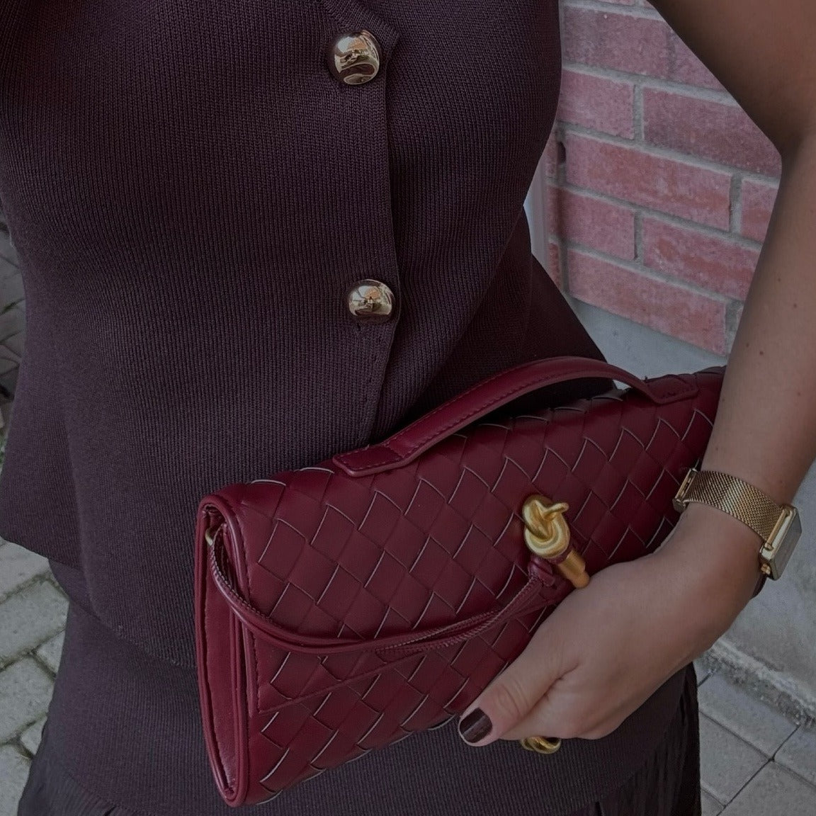 Introducing our Bianca Woven Bag, a sophisticated piece that showcases the house’s signature leather craftsmanship and meticulous attention to detail. Expertly crafted from premium vegan leather, it features a beautifully woven texture enhanced by a unique knot tie detail with a polished gold-tone toggle fastening, adding a touch of refined elegance. Its compact yet practical size is designed to fit your essentials — from your phone to a cardholder and lipstick — making it the perfect companion for events, dinners, and special occasions when you prefer to travel light. Combining timeless style with sustainable materials, the Bianca Woven Bag is a must-have accessory for the modern, eco-conscious wardrobe.
