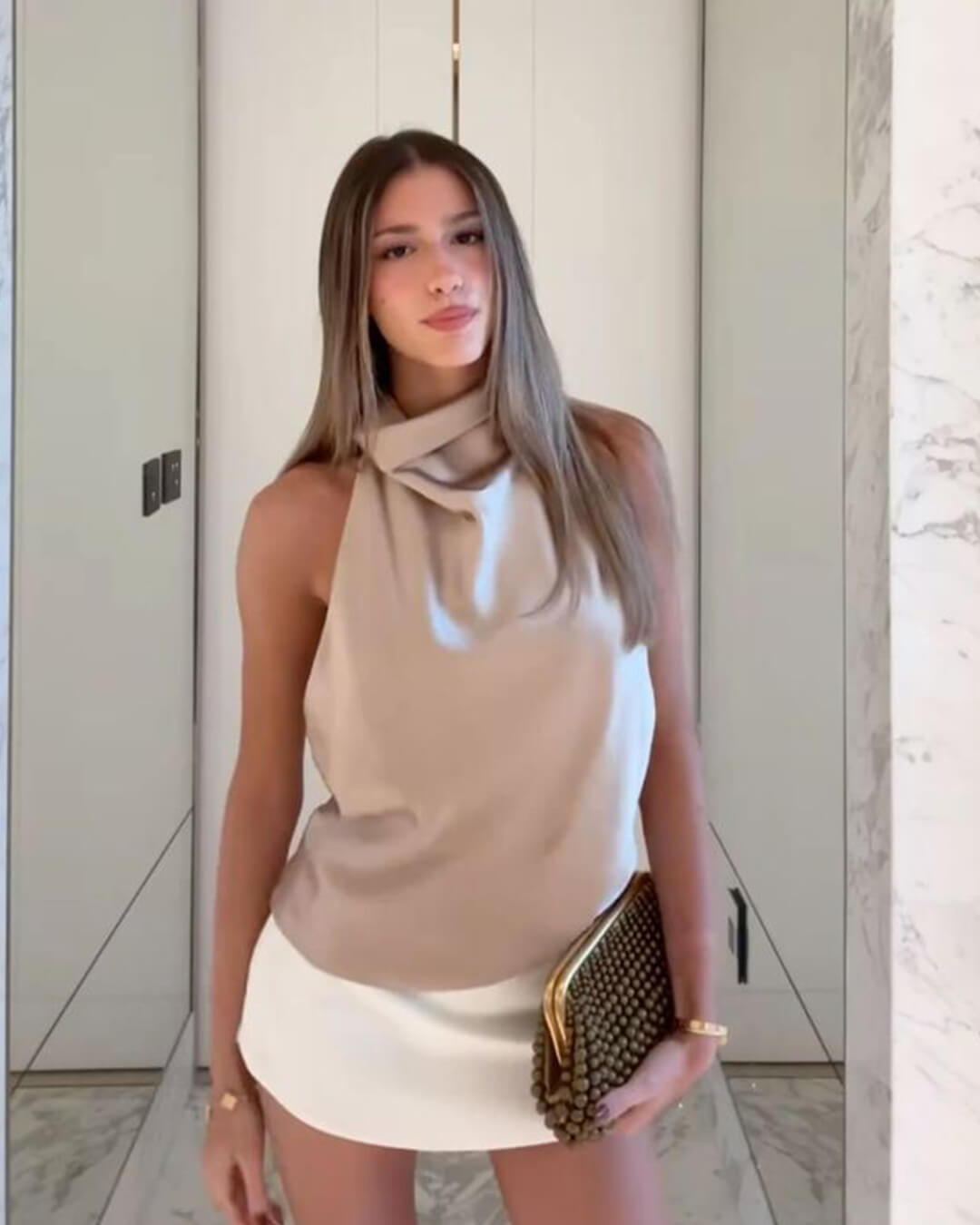 The Anastasia Halter Backless Satin Top is a chic and elegant piece that enhances your seasonal wardrobe. With its smooth satin finish, this top adds a touch of sophistication to any outfit.