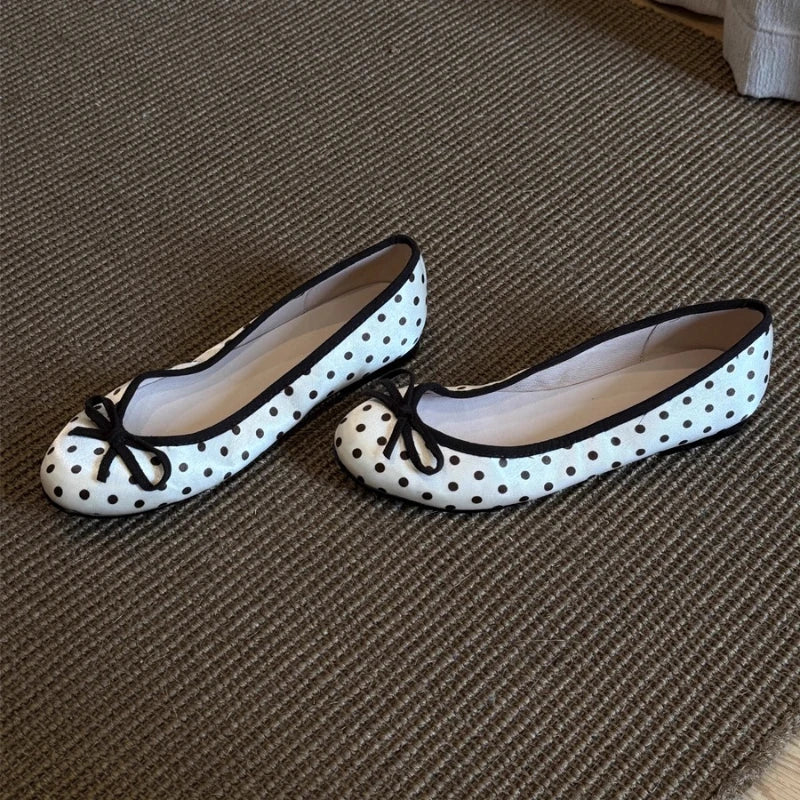 - Style: Polka dot ballet flats with bow detail